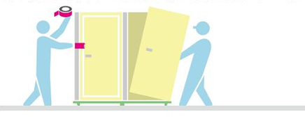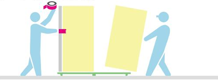 壁パネルを溝に差し込んだ後は、柱と壁を付属のテープで仮止めする。