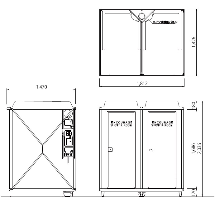 | 材 質 | 屋根・床パネル・入口パネル/FRP積層成形 壁材/パラビーム 3DFRP成形品(超軽量材) シャワー機能パネル/FRP積層成形 2室合体型 |